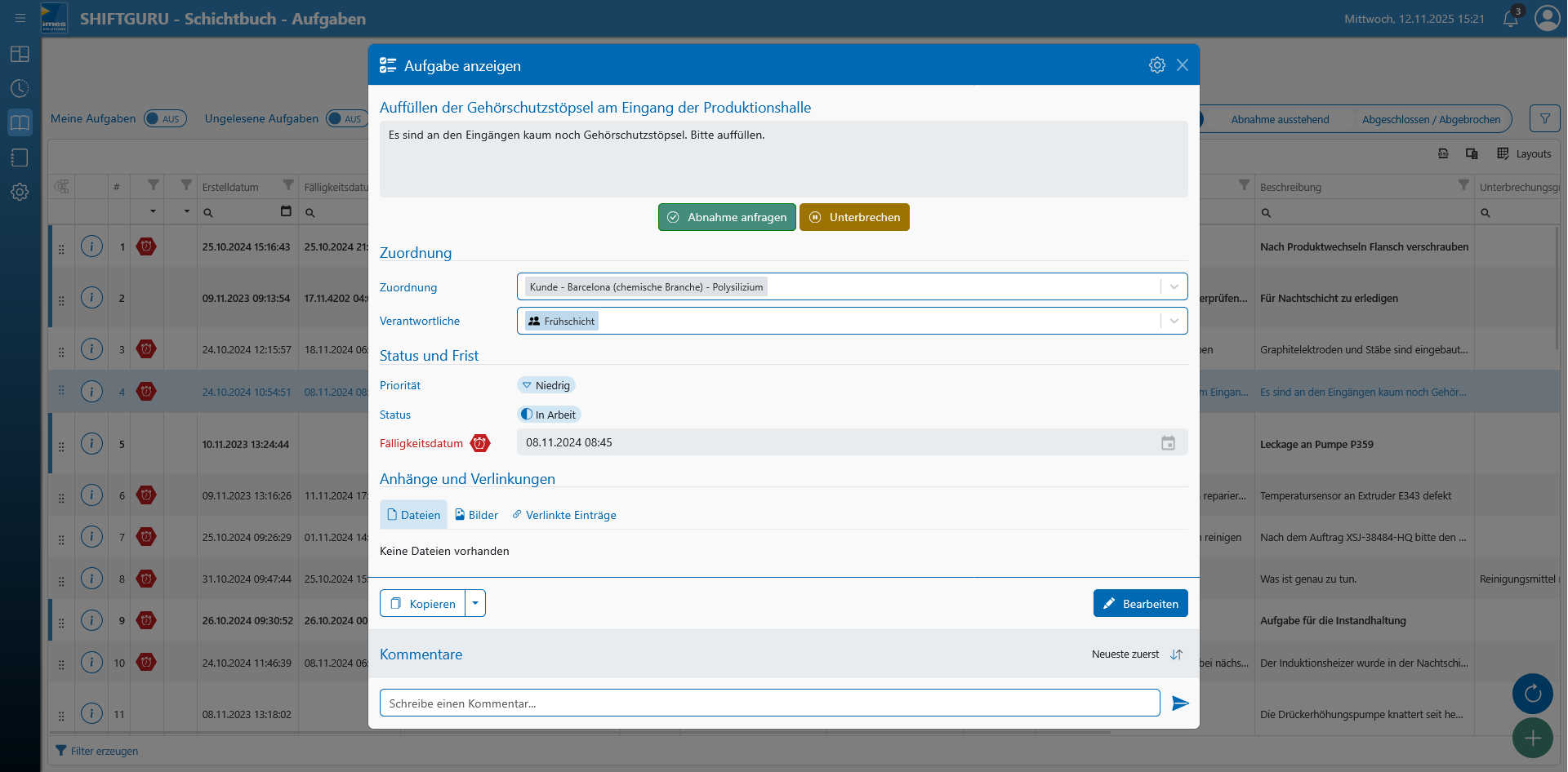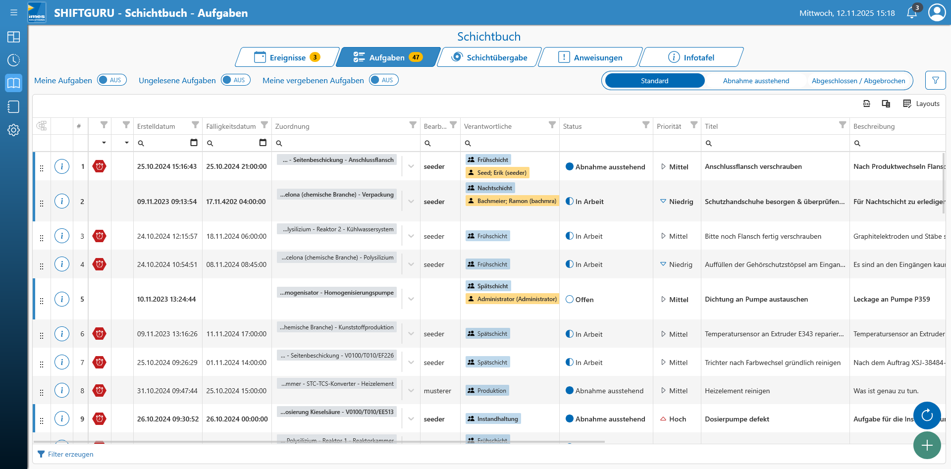 Schichtanweisungen und Aufgaben